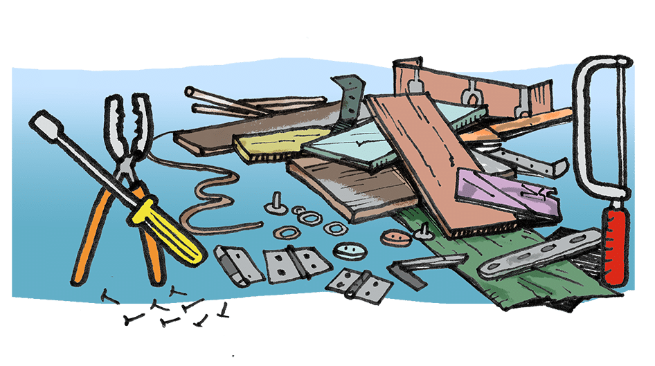 We leveren voor deze workshop diverse ‘afval’materialen zoals houten planken, metalen onderdelen, schroeven, touw enzovoort.