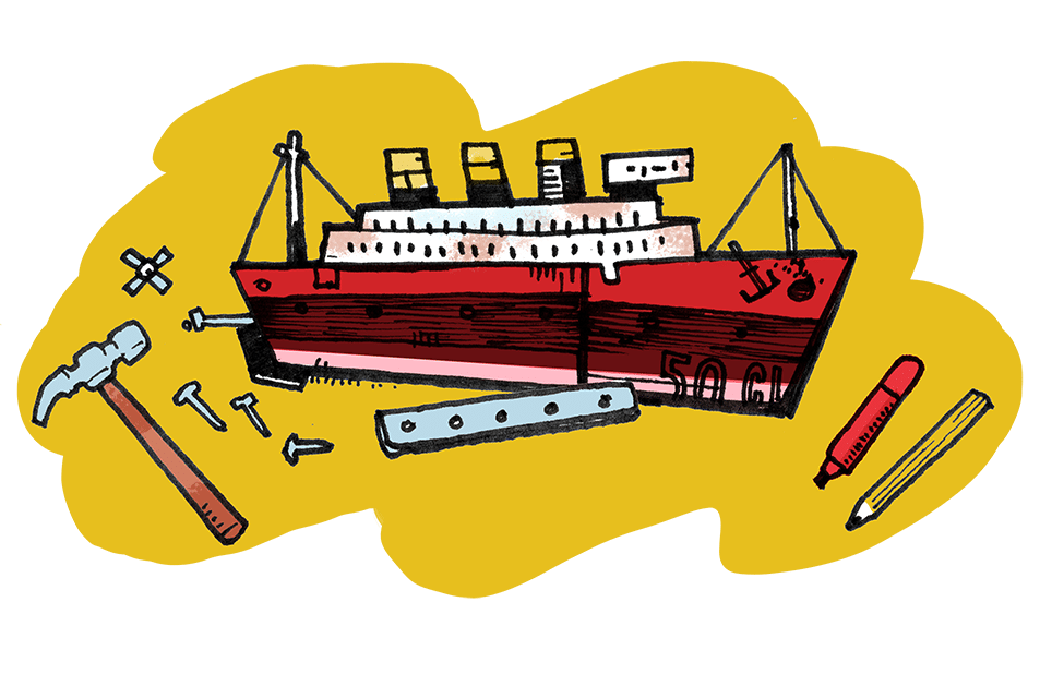 Leerlingen worden uitgedaagd om op creatieve wijze gebruik te maken van oude scharnieren, schroeven, touw, etc. om details zoals de romp, reling en andere elementen te maken.
